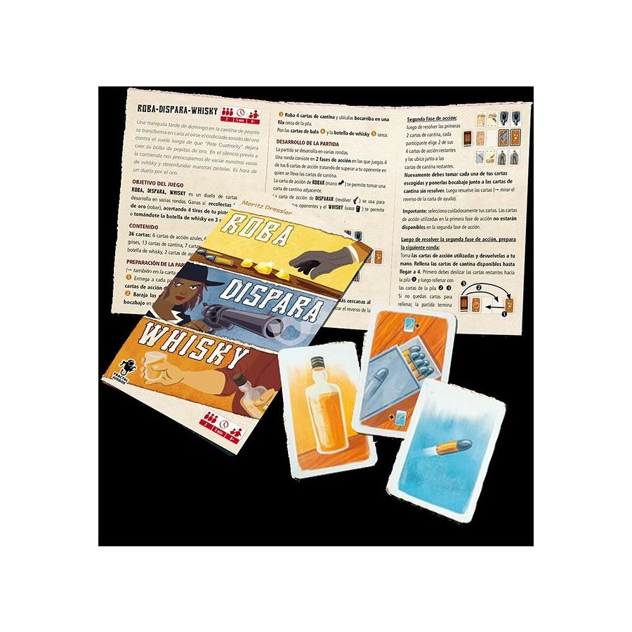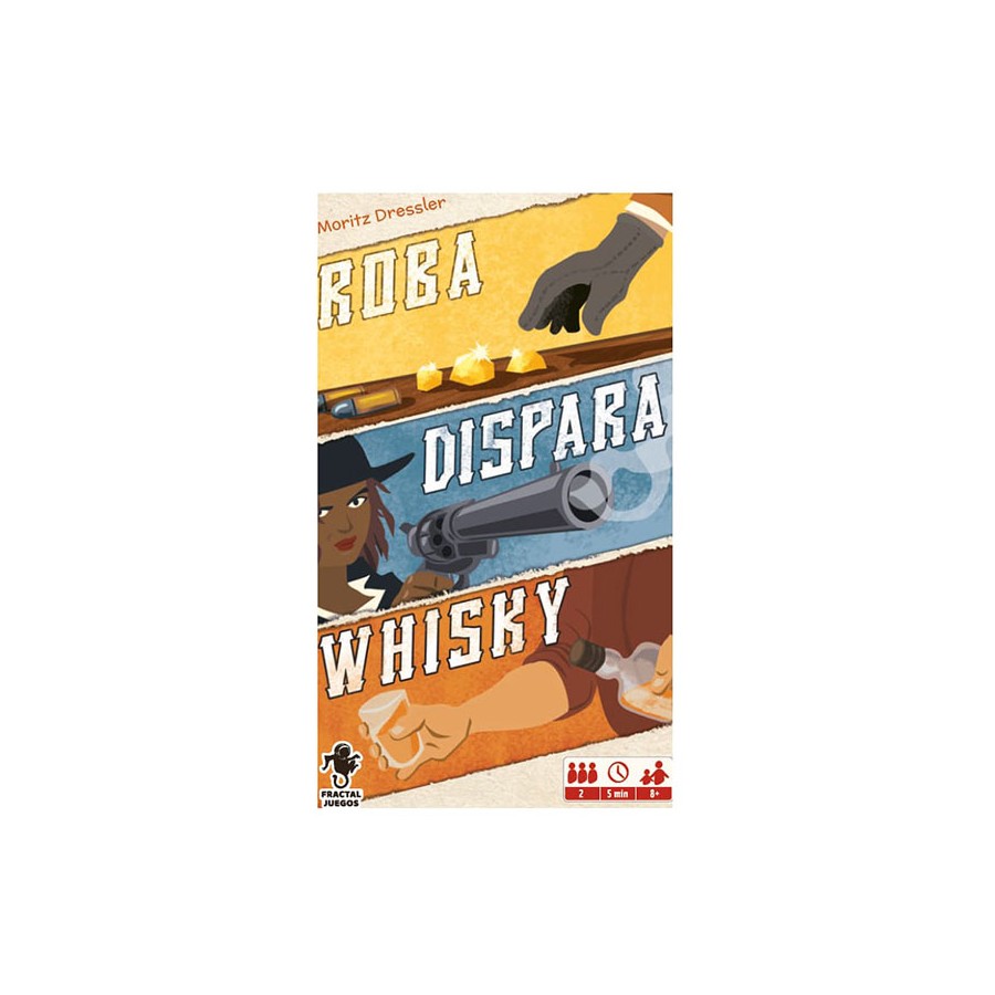 Roba, Dispara, Whisky es un rápido duelo de cartas que no se decide por piedra, papel o tijera, sino que por oro, pistolas y whisky.