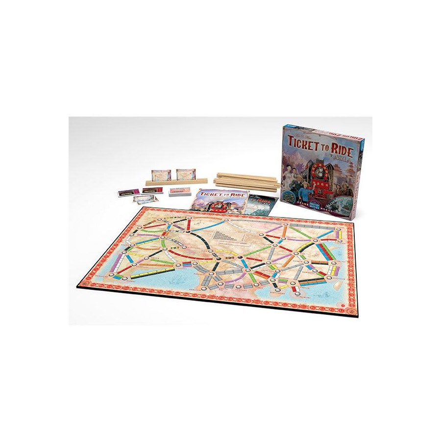 ¡Aventureros al Tren! Asia es el primer volumen de esta línea, y ha sido diseñado para partidas de hasta 6 jugadores, en las que un compañero y tú competiréis contra otros equipos en un salvaje recorrido de 25.000 Km. desde Kabul hasta Pekín, a través de las estepas de Mongolia y el desierto del Gobi, hasta el río Amarillo. O, si prefieres los sosegados placeres del viaje en solitario a lo largo de la Ruta de la Seda, o encontrar tu camino en el bullicio de Indochina, aventúrate en la Asia Legendaria… pero prepárate para un aterrador itinerario a través de los pasos montañosos del Himalaya.