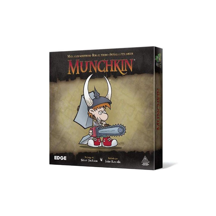 Este juego completo captura la esencia de la “Experiencia Dungeon” sin todas esas idioteces del rol. Todo lo que tienes que hacer es matar monstruos y coger objetos mágicos. ¡Y qué objetos mágicos! Ponte el Yelmo Cornudo y las Botas de Invocación de Hemorroides. Blande el Báculo de Napalm o quizás la Motosierra de Mutilación Sangrienta. Empieza masacrando a la Planta en un Tiesto y a la Babosa Babeante, y encuentra la manera de llegar al Dragón de Plutonio. Munchkin es rápido de jugar y ridículo, y puede llevar a cualquier grupo de jugadores de rol a la risa histérica. Y mientras se ríen, puedes robarles lo que lleven.
