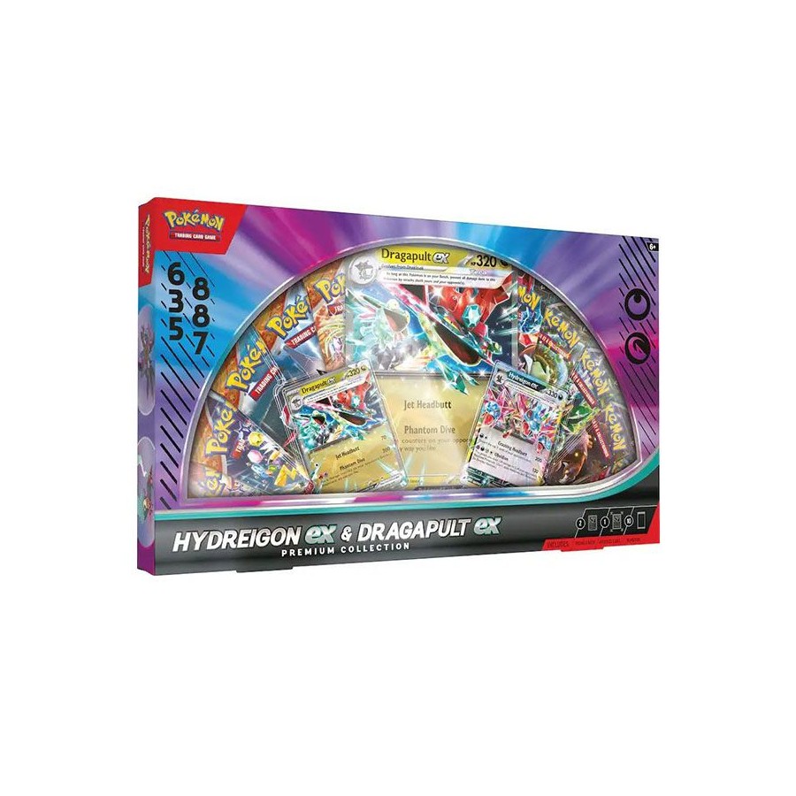 Este estuche de colección de la serie Pokémon, titulado Hydreigon ex & Dragapult ex Premium Collection, reúne dos poderosas cartas tipo ex —Hydreigon ex y Dragapult ex— en un formato especial pensado tanto para coleccionistas como para jugadores del juego de cartas.